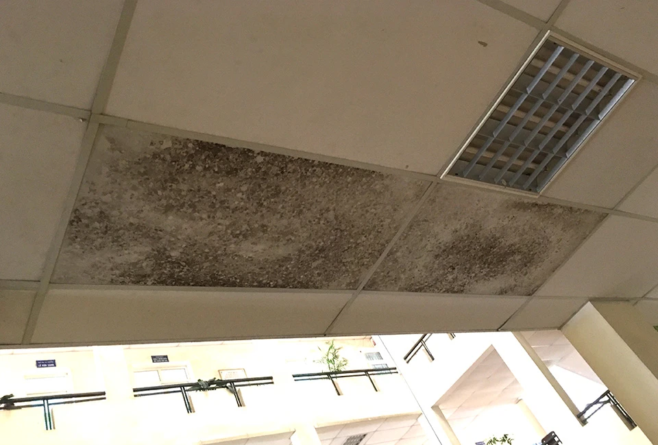 Một số điểm trần thạch cao của tòa nhà bị bong tróc? Ảnh: Đ.TRUNG