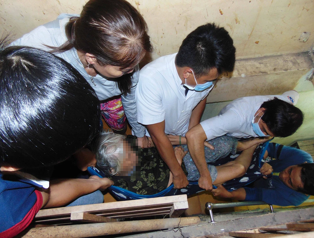 Sau khi thăm khám, y sĩ Minh quyết định chuyển bà H. tới bệnh viện (BV) điều trị. Ngặt nỗi cầu thang quá hẹp, chỉ khoảng 50 cm nên không thể đưa băng ca lên. Y sĩ Minh đề nghị gia đình bà H. tìm thêm người trợ giúp.