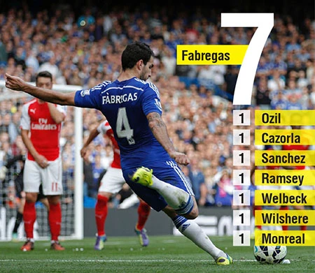 Qua thống kê từ đầu mùa đến nay, Cesc Fabregas đã có bảy đường kiến tạo thành bàn và là cầu thủ có tỉ lệ chuyền thành bàn trong tốp cao nhất Premier League. Con số đấy bằng tổng số các đường chuyền của những cầu thủ Arsenal cộng lại khiến ông Wenger thèm thuồng. Đặc biệt nhất là đường chuyền sắc như dao của Fabregas trong trận thắng Arsenal 2-0 mà Cesc Fabregas như đặt vào chân Diego Costa để cầu thủ này chỉ làm động tác tiếp theo là đưa bóng vào lưới.