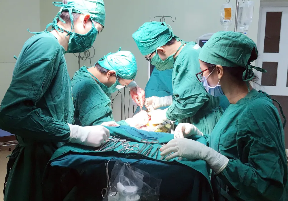 Các bác sĩ đang phẫu thuật lồng ngực cho ông C. Ảnh: LÊ PHỤNG