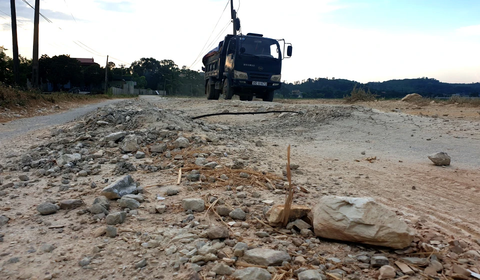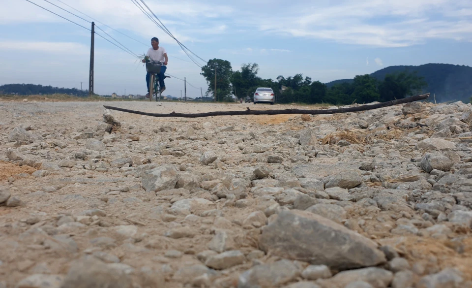 Đá to, đá nhỏ nằm lởm chởm trên đường, gây cản trở giao thông. Ảnh: ĐẶNG TRUNG