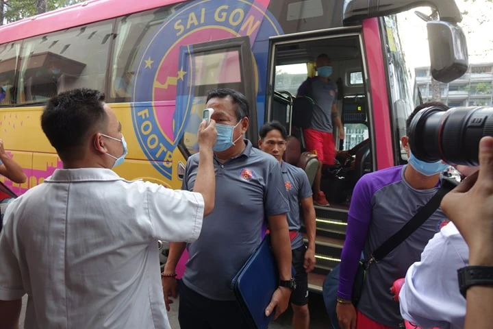 HLV Hoàng Văn Phúc của Sài Gòn FC đang được kiểm tra thân nhiệt trước khi vào sân Thống Nhất.