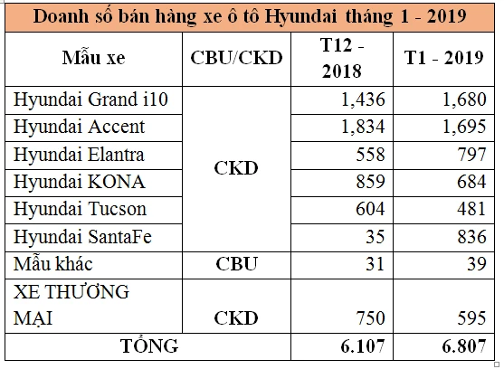Theo đó, tổng doanh số tháng 1 của nhà phân phối này đạt 6.807 xe, tăng trưởng 11% so với tháng 12-2018. Trong tháng 1, doanh số Accent có sự sụt giảm nhẹ, tuy nhiên vẫn giữ vũng vị trí đầu bảng với 1.695 xe bán ra. Grand i10 đứng thứ 2 với 1.680 xe, tăng 17% so với tháng trước.