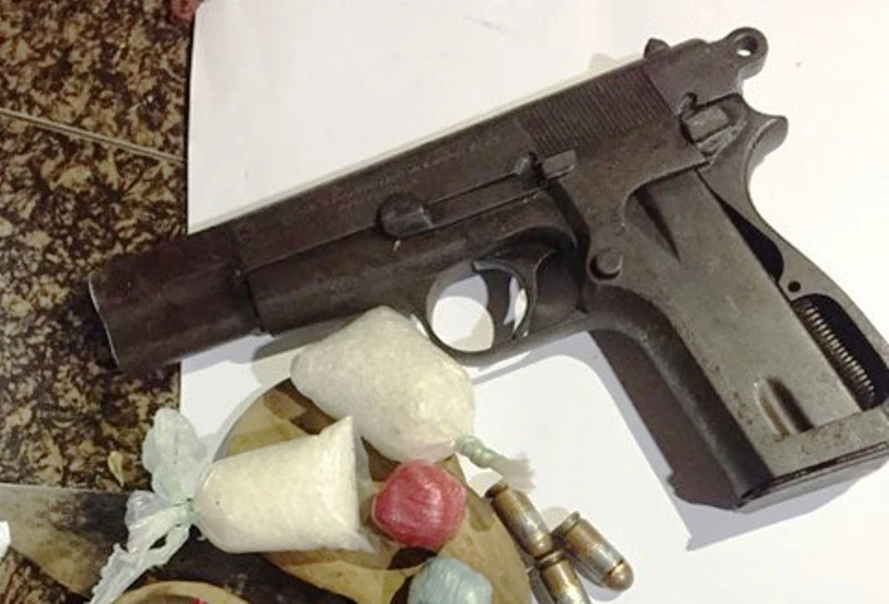 Công an thu giữ trong nhà Xá một khẩu súng K54, 3 viên đạn, 2 gói ma túy gồm hơn 30 g ma túy đá, 5,32 g heroin, một con dao nhọn và môt cân tiểu ly.