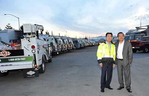 David Duong (Tổng Giám đốc) và Victor Duong (Phó Tổng Giám đốc) của CWS chụp ảnh trước đoàn xe mới chạy bằng khí tự nhiên CNG.