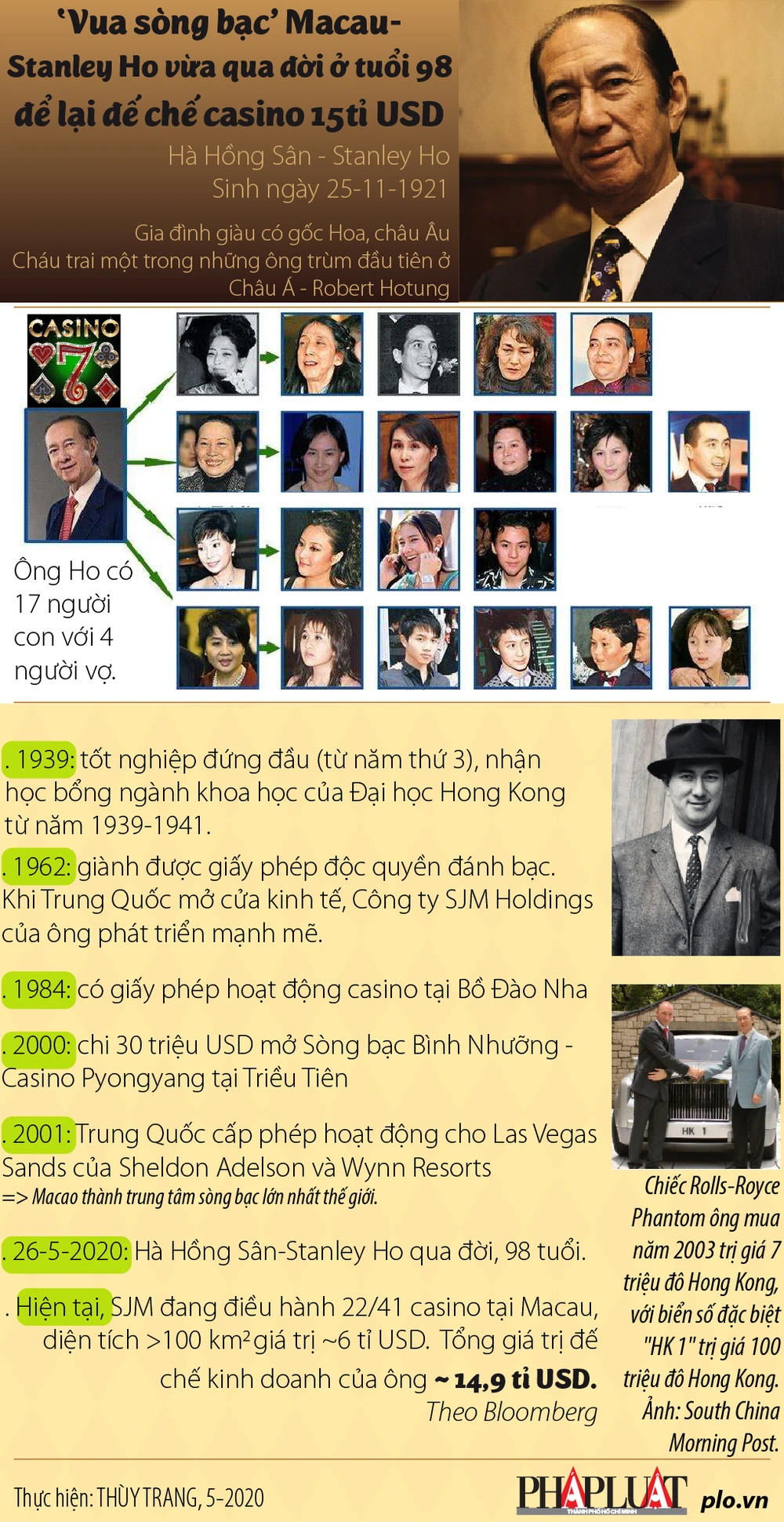(PLO)- ‘Vua sòng bạc' Macau- Hà Hồng Sân - Stanley Ho vừa qua đời ở tuổi 98, để lại đế chế casino gần 15 tỉ USD và 17 người con.
