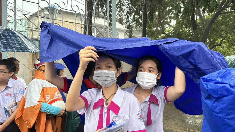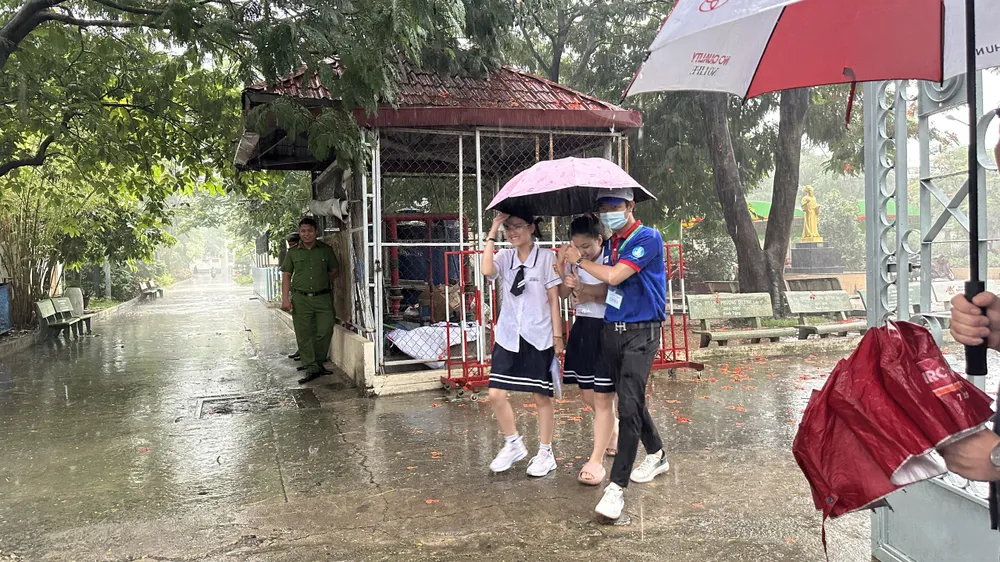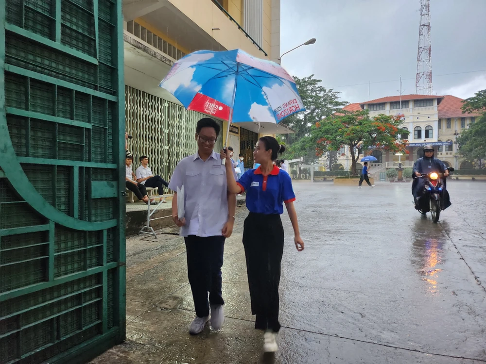 Vừa thi xong môn Toán, thí sinh đã có ô dù che chắn vì mưa lớn