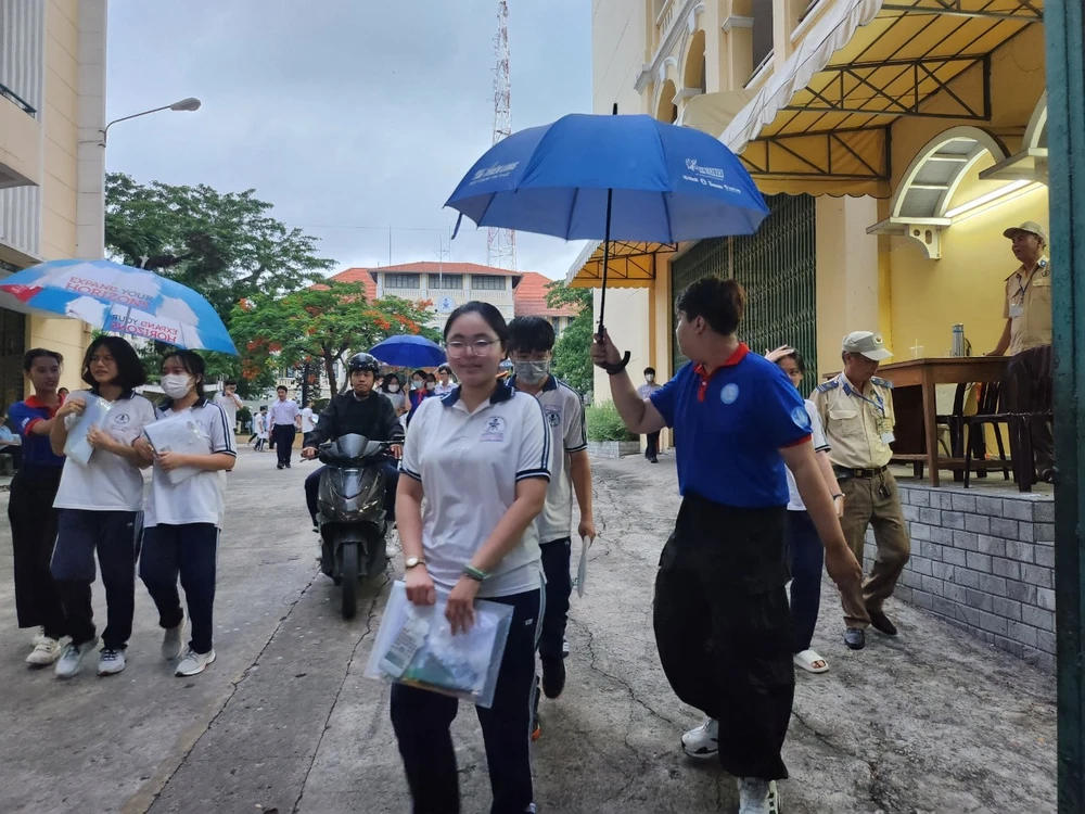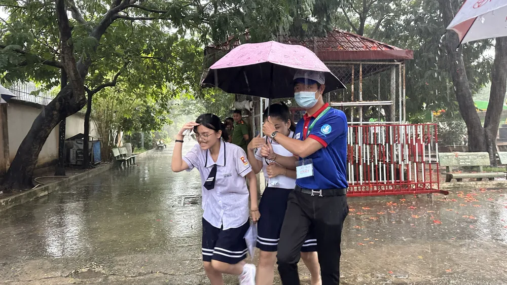 (PLO)- Thí sinh ở TP.HCM vừa rời phòng thi môn Toán cũng là lúc trời đang mưa, lực lượng tiếp sức mùa thi đã nhanh chóng hỗ trợ để các em rời điểm thi không bị ướt, ảnh hưởng sức khoẻ cho ngày thi tiếp theo.