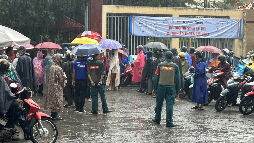 Ở điểm thi Trường THCS Nguyễn Trãi, quận Gò Vấp, TP.HCM, phụ huynh mặc áo mưa kiên nhẫn đứng chờ con. Các lực lượng chức năng hỗ trợ kỳ thi như sinh viên tình nguyện, cảnh sát giao thông, dân quân tự vệ...phải mặc áo mưa túc trực ở cổng trường thực hiện nhiệm vụ.