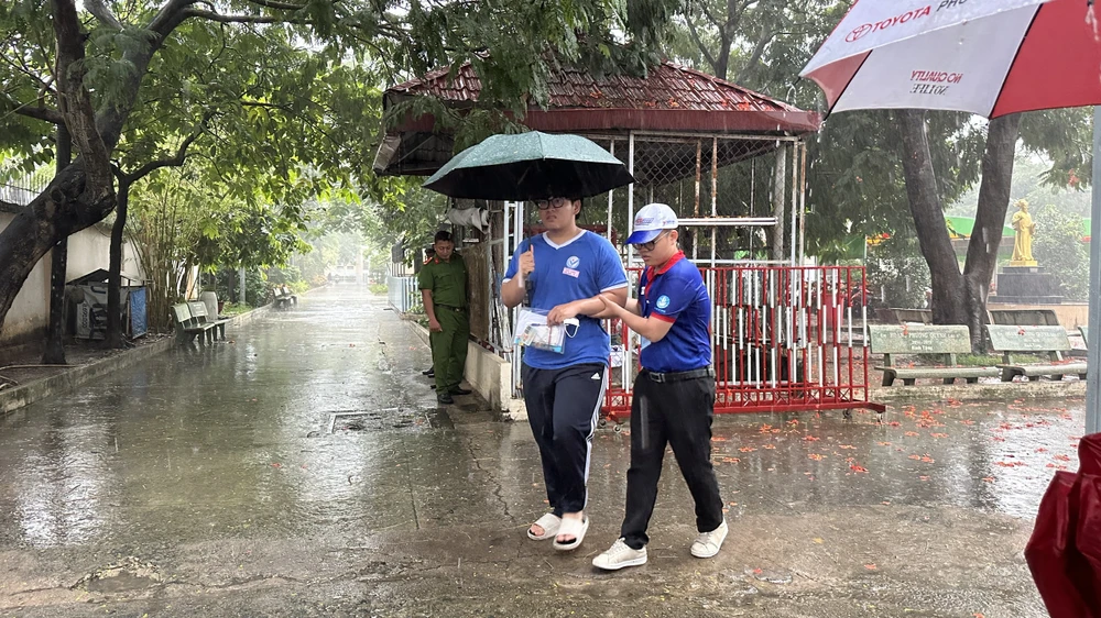 Lực lượng tình nguyện viên tiếp sức mùa thi đã chuẩn bị sẵn dù, áo mưa để giúp thí sinh di chuyển ra xe để về nhà nghỉ ngơi sớm nhằm chuẩn bị cho buổi thi sáng mai (29-6).