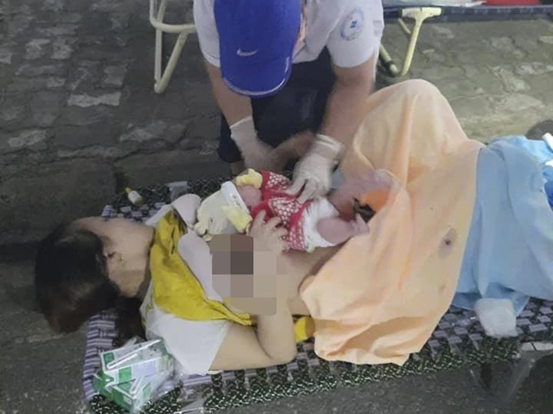 Lực lượng chức năng đỡ đẻ cho chị L. ngay tại chốt kiểm tra y tế số 4. Ảnh: CTV