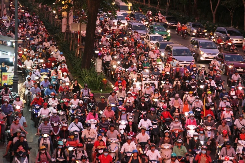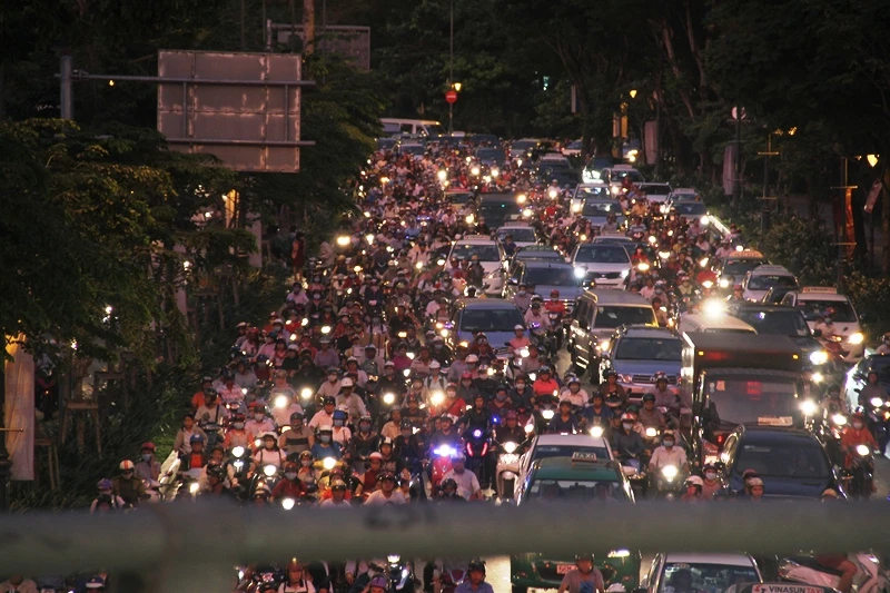 Đường Tôn Đức Thắng, quận 1, 20 giờ đêm, hàng ngàn phương tiện ùn ứ, kẹt cứng.