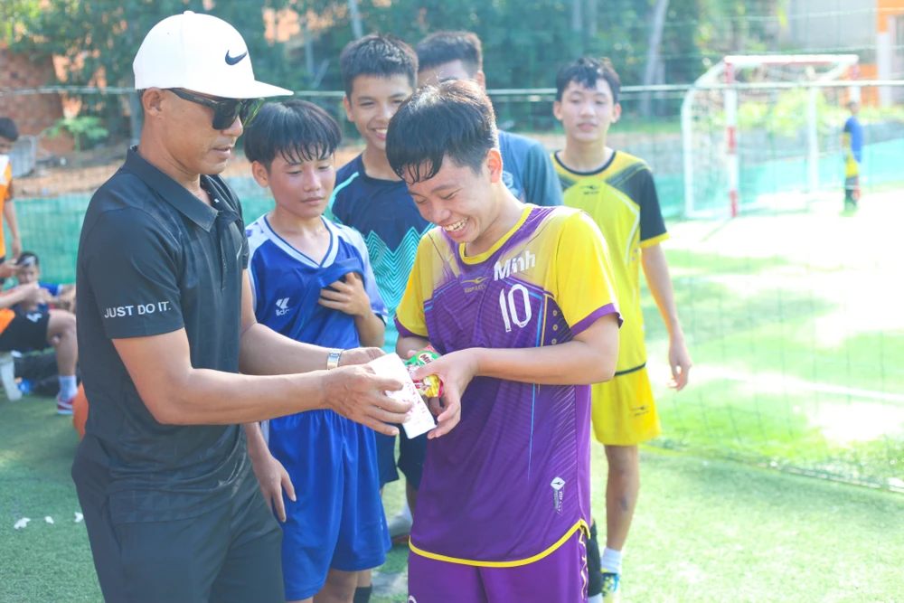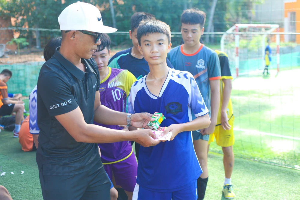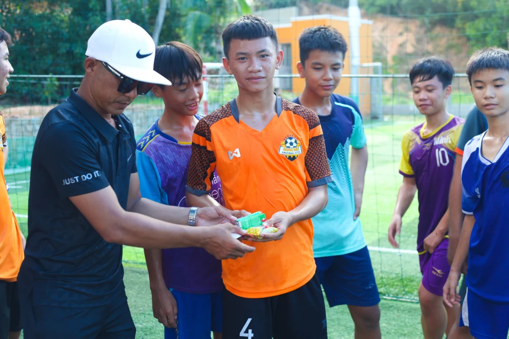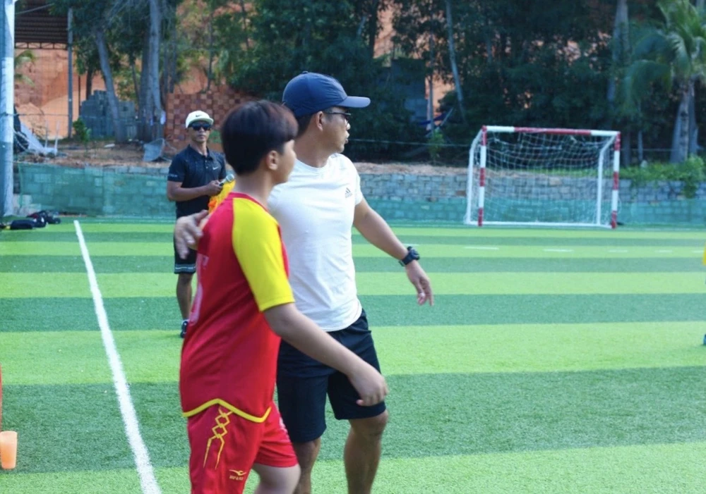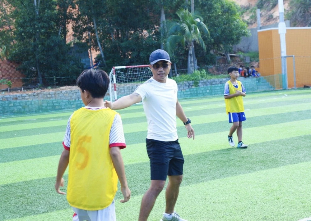 Thầy Phong tận tình hướng dẫn cho các cầu thủ nhí từng kỹ thuật chơi bóng với khao khát truyền ngọn lửa đam mê cho lứa trẻ ở Bình Thuận, sau khi anh giải nghệ về lại quê nhà.