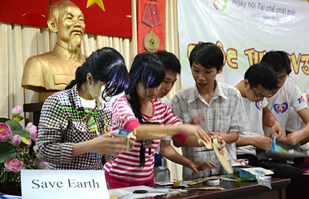 Các đội thi trổ tài khéo tay làm đồ dùng từ vật dụng tái chế. Ảnh: NGỌC CHÂU