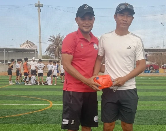 Cặp tiền đạo Lê Thanh Phong (phải) và Ngũ Chí Thắng ngày nào khoác chung màu áo, giờ là thầy của các lớp bóng đá cộng đồng gieo tình yêu quả bóng tròn cho thế hệ trẻ.