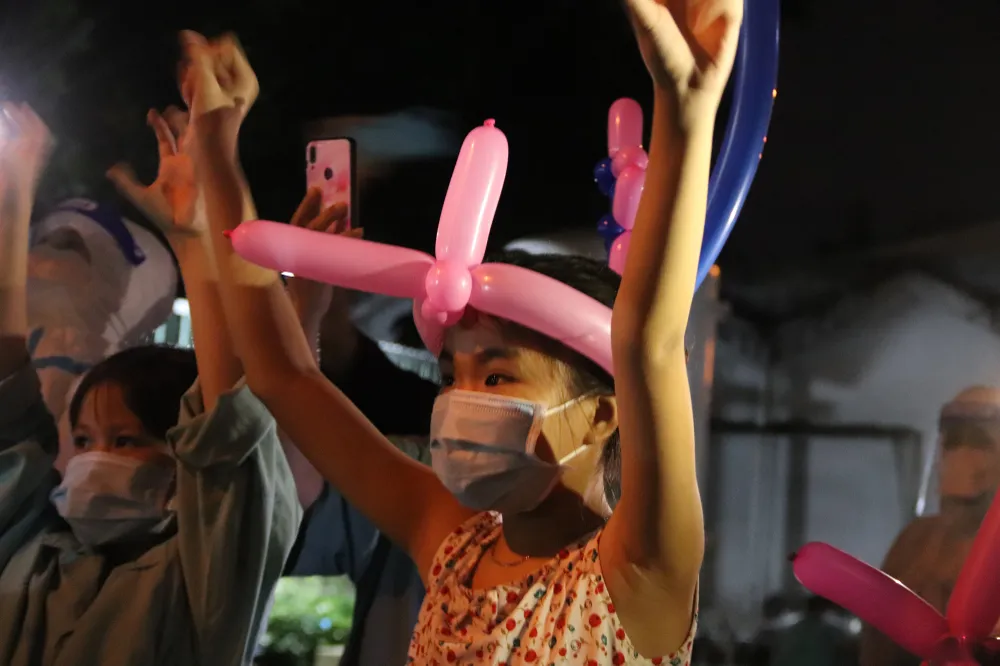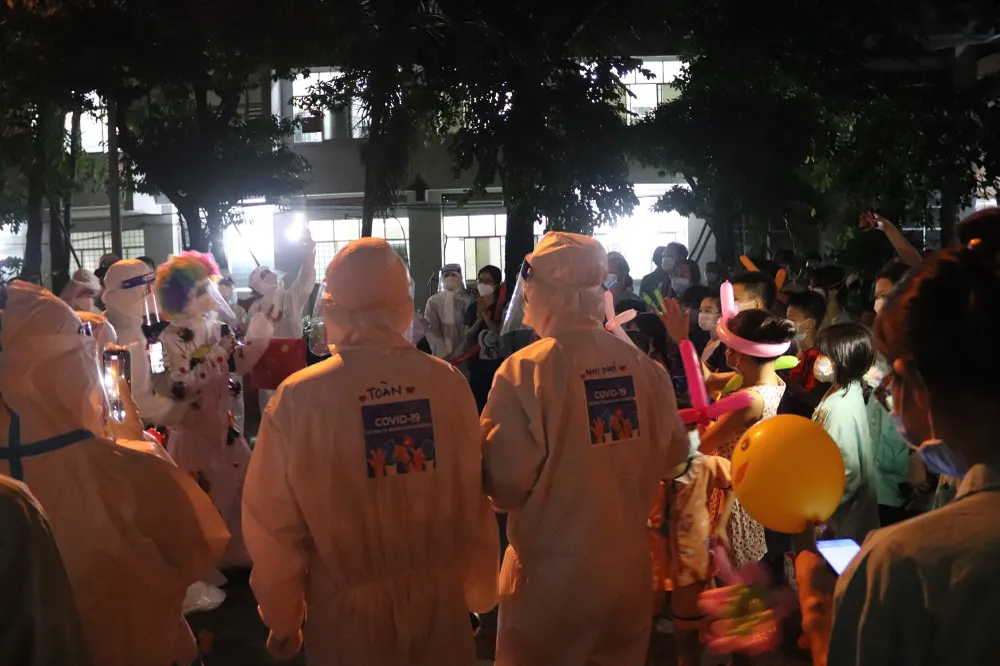 Tối qua, tại Bệnh viện điều trị COVID-19 Trưng Vương, 34 em nhỏ đang điều trị tại nơi đây đã được vui Đêm hội trăng rằm trong khuôn viên bệnh viện. Các y bác sĩ, tình nguyện viên trong bộ đồ bảo hộ kín mít liên tục pha trò, hướng dẫn các em nhảy trên nền nhạc sôi động.