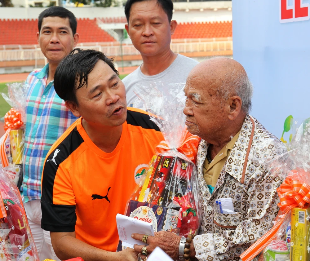 Các cựu tuyển thủ TP.HCM vui vẻ với những phần quà do nhiều mạnh thường quân hỗ trợ, như Phó Tổng biên tập báo Pháp Luật TP.HCM - ông Nguyễn Đức Hiển và bạn bè đóng góp 140.200.000 đồng.