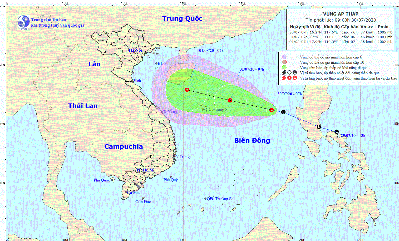 Sáng 30-7, Trung tâm Dự báo khí tượng thủy văn quốc gia cho biết áp thấp đã đi vào biển Đông, còn cách quần đảo Hoàng Sa 600 km về phía đông.