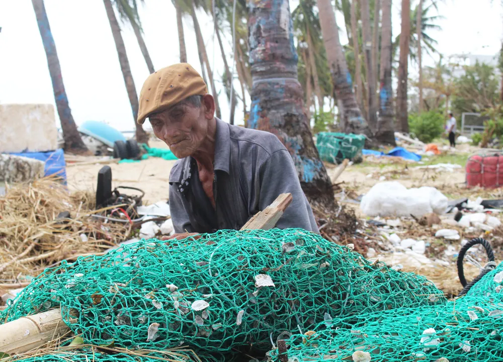 Chiếc tàu bị vỡ, ngư cụ cũng bị bão xé nát, vung khắp nơi. Anh Hà Lợi tìm nhặt lại những tấm lưới rối tinh trên bờ. Ảnh: TẤN LỘC