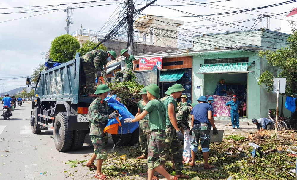 Phần lớn các công trình hạ tầng giao thông, trường học, công sở... ở huyện Vạn Ninh bị tàn phá. Hiện nay, các lực lượng vũ trang nỗ lực giúp người dân dọn dẹp đường sá. Ảnh: TẤN LỘC
