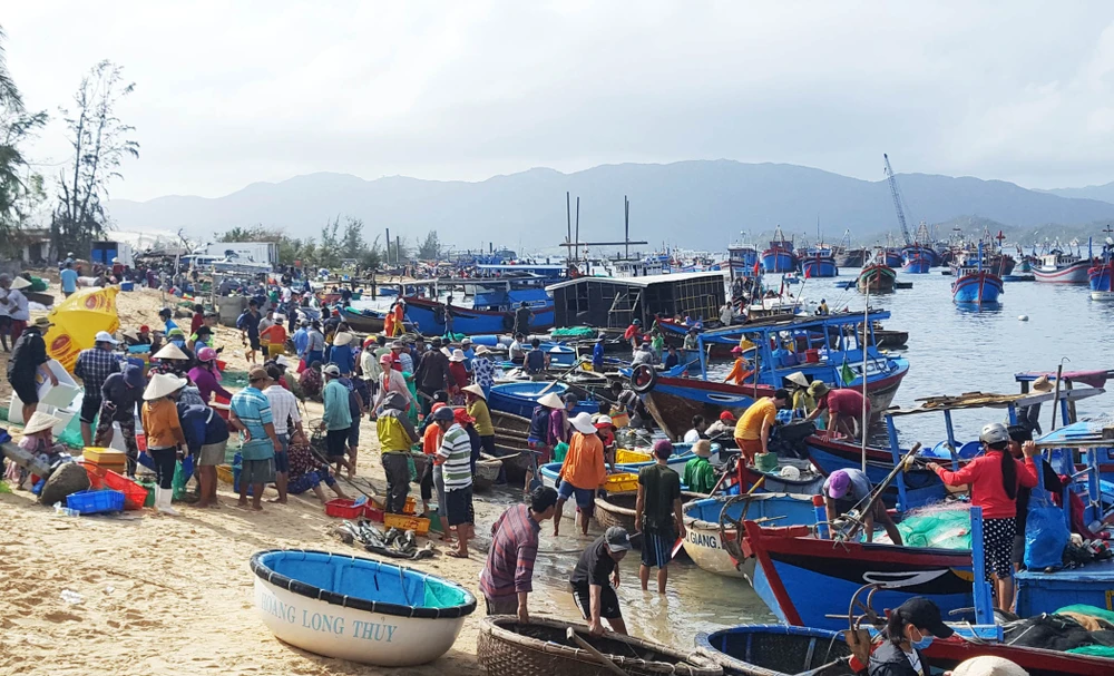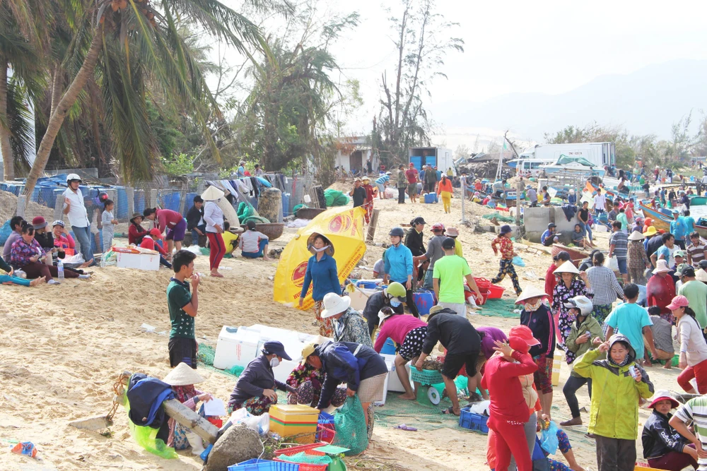 Ngành thủy sản huyện Vạn Ninh bị thiệt hại nặng nhất tỉnh Khánh Hòa trong khi phần lớn người dân địa phương sống bằng nghề này. Để sớm ổn định cuộc sống, người dân đang nỗ lực khôi phục lại các hoạt động khai thác, mua bán thủy sản. Trong ảnh là cảnh mua bán cảng cá Đầm Môn. Ảnh: TẤN LỘC