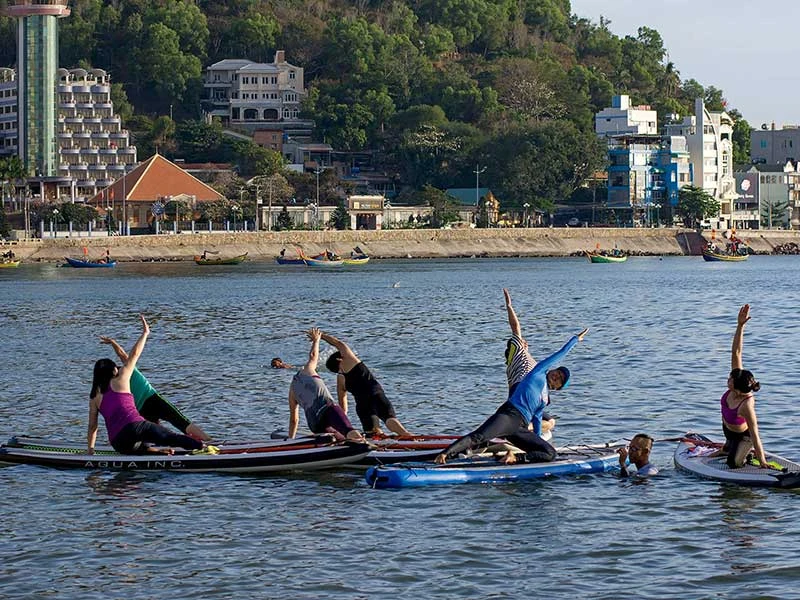 Nhóm du khách tập yoga trên mặt biển trong xanh. Ảnh: TRÙNG KHÁNH