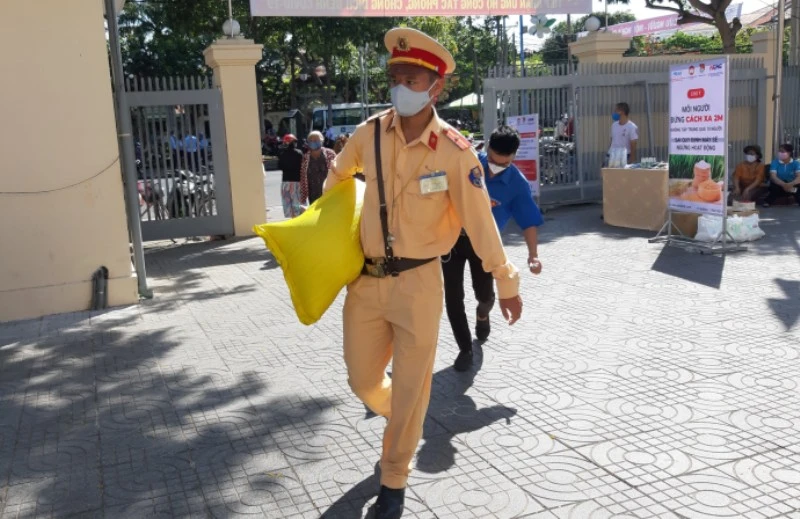 CSGT và các đoàn viên, thanh niên tham gia vận chuyển gạo