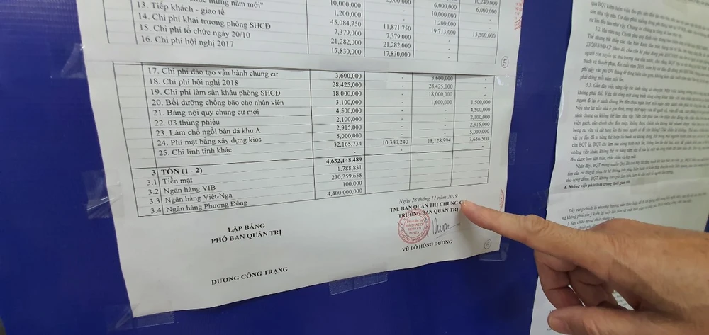 BQT nhà chung cư Hodeco Plaza trao đổi với Pháp Luật TP.HCM về những khoản thu, chi do BQT lập, gửi cư dân-Ảnh:TK