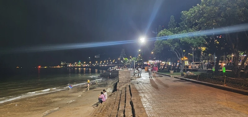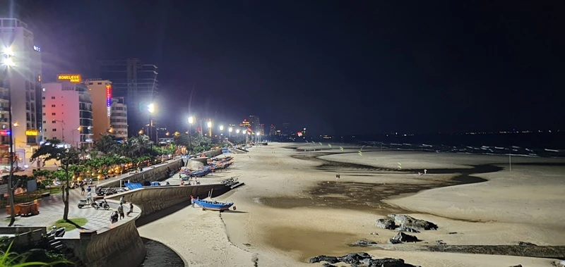 Người dân vui chơi tại Bãi Trước muộn hơn khi bên bờ biển được lắp đèn sáng rực. Ảnh:TK