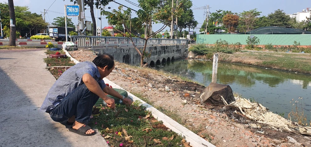 Anh Cường chăm sóc, trồng thêm hoa ở bờ kênh trước nhà-Ảnh:TK