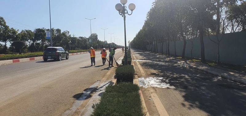 Nhân viên quét dọn thường xuyên quanh dự án Vườn Xuân để tránh rơi vãi đất đá ảnh hưởng giao thông đường 3 Tháng 2- Ảnh:TK