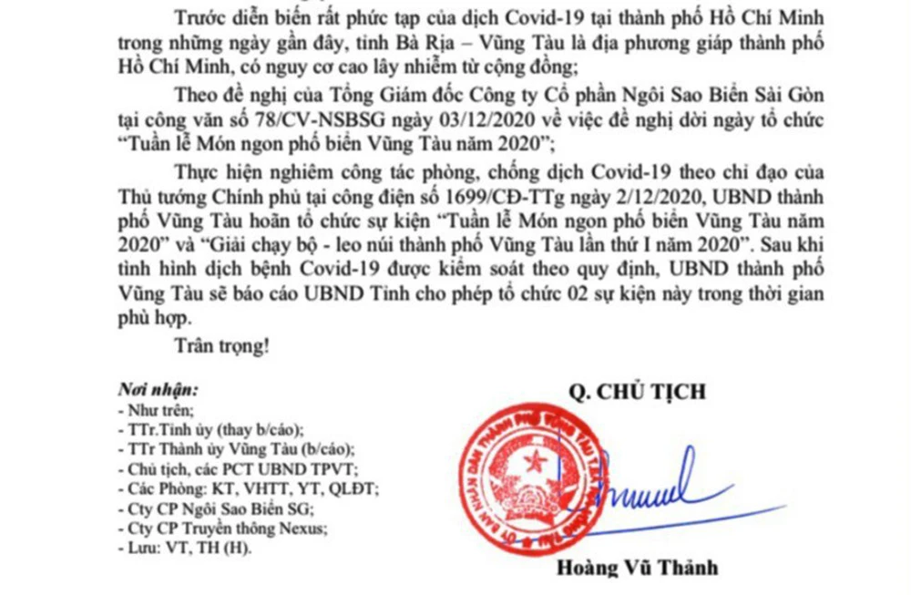 Theo đề nghị của công ty Cổ phần Ngôi Sao Biển Sài Gòn và thực hiện nghiêm công tác phòng, chống dịch COVID-19, UBND TP Vũng Tàu quyết định hoãn tổ chức sự kiện “Tuần lễ Món ngon phố biển Vũng Tàu năm 2020” và “Giải chạy bộ - leo núi thành phố Vũng Tàu lần thứ I năm 2020”.