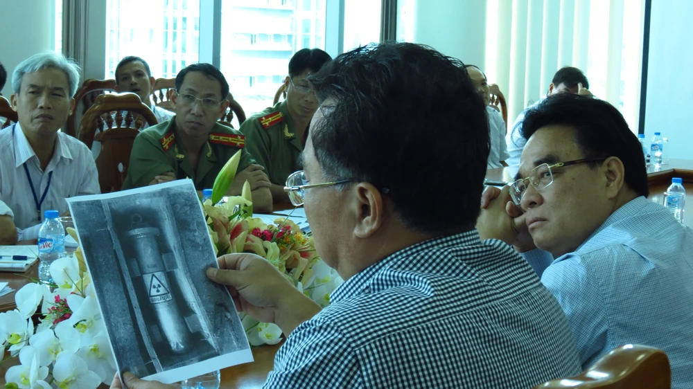 Ông Lê Thanh Dũng- Phó chủ tịch UBND tỉnh Bà Rịa-Vũng Tàu (trái) và ông Vương Hữu Tấn, Cục trưởng cục An toàn Bức xạ và Hạt nhân chỉ đạo tại cuộc họp khẩn cấp sáng 6-4.