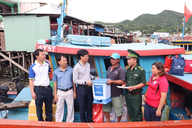 Lãnh đạo Vũng Tàu tuyên truyền không xả rác xuống kênh, tặng thùng rác cho đại diện các chủ tàu cá. Ảnh: TK