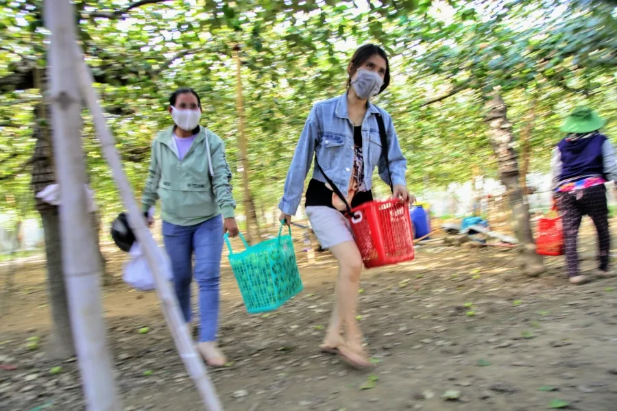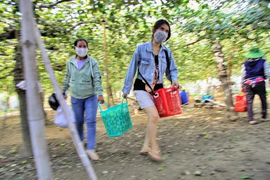 Chiều xuống, Mỹ Thoa cùng bà mẹ dồn tất cả số táo trên 30 kg vừa hái vào túi, rồi cột lên xe cho tôi, nhờ chuyển tới khu cách ly tập trung tại huyện Ninh Phước. Xe chạy, bà mẹ còn dặn với theo: "Cỡ 4, 5 ngày nữa chín rộ, anh em cần hỗ trợ đâu, cứ ghé hái nhen!"