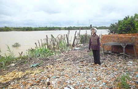 Mặc dù đã có cừ tràm chống sạt lở nhưng khu vực nhà bà Đặng vẫn đứng trước nguy cơ bị nước cuốn trôi do tranh chấp việc bồi thường đất chậm giải quyết. Ảnh: MQ