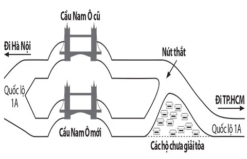 Để làm tuyến đường dẫn lên hai đầu cầu, theo phương án được phê duyệt thì cần giải tỏa 44 hộ (23 hộ giải tỏa trắng, 21 hộ giải tỏa một phần). Đến nay 23 hộ giải tỏa trắng đã di dời, riêng 21 hộ còn lại không bàn giao mặt bằng do chưa nhận đủ tiền bồi thường.