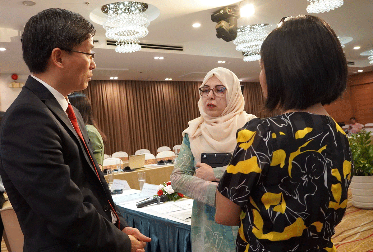 Thứ trưởng Bộ Tư pháp Nguyễn Khánh Ngọc (trái) đang trao đổi với các đại biểu bên lề hội thảo. Ảnh: NQ