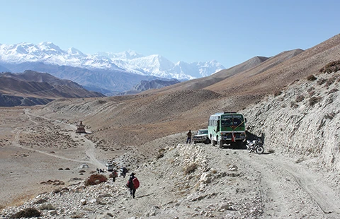 Dù đã chuẩn bị tinh thần để leo lên những chuyến xe bão táp nhưng thực tế đường tới Mustang cực nhọc hơn tôi hình dung nhiều lần. Có hôm tôi phải ngồi trên nóc xe buýt từ sáng đến tối mịt cùng với hơn bốn mươi người. Thời tiết vùng núi vô cùng khắc nghiệt, sáng sớm sương mù tê tái nhưng đến trưa thì nắng chói chang, chiều về lại lồng lộng gió. Đường đi mịt mờ bụi bặm. Không biết bao nhiêu lần tôi phải nhắm mắt lại khi những chuyến xe già nua đang cõng tôi và hàng chục con người oằn mình bò qua những con đường cheo leo bên miệng vực thẳm.