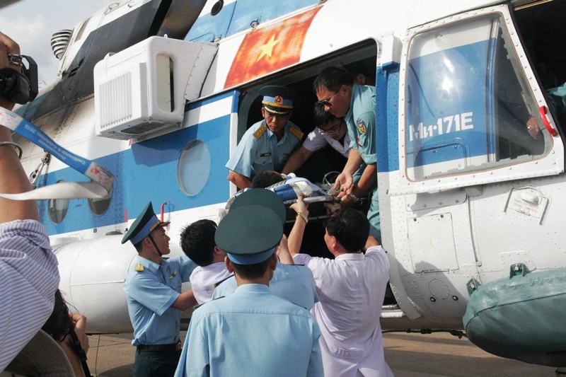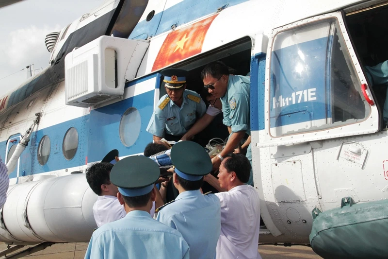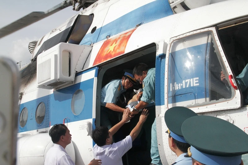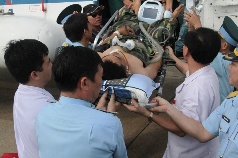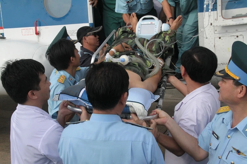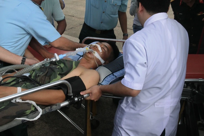 Đại úy Trần Văn Đinh gặp nạn tại đảo Song Tử Tây thuộc quần đảo Trường Sa của Việt Nam, vào đất liền cấp cứu trong sự quan tâm chăm sóc của tất cả mọi người.