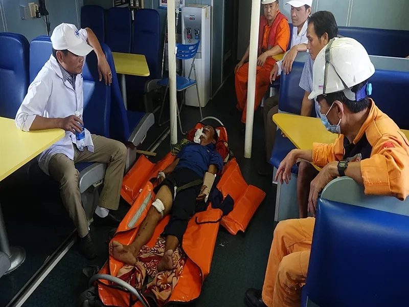 Vượt qua hơn 300 hải lý trong điều kiện thời tiết nguy hiểm do gió mùa, mưa dông, sóng cao trên 3 m. Các bác sĩ và nhân viên cứu nạn nhanh chóng sang tàu ĐNa-90469 bằng ca nô cứu nạn để cấp cứu bệnh nhân.