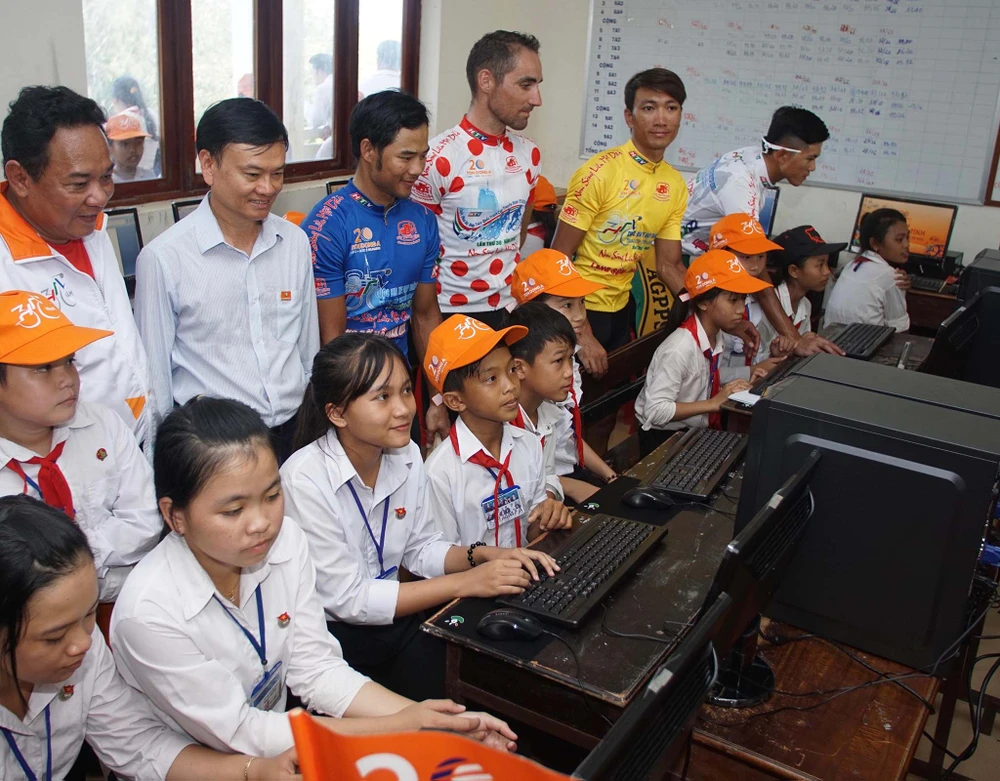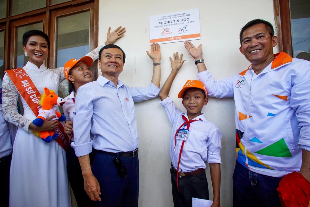 Sau khi nhận thưởng tại cột mốc tọa độ quốc gia GPS 001, bốn tay đua dẫn đầu các danh hiệu cá nhân Nguyễn Thành Tâm (áo vàng), Lê Nguyệt Minh (áo xanh), Ngô Văn Phương (áo trắng), Loic Deriac (áo chấm đỏ) cùng chủ tịch HĐQT - Tổng Giám đốc Công ty CP Tôn Đông Á, ông Nguyễn Thanh Trung, hoa hậu H’Hen Niê, nghệ sĩ Việt Hương đến thăm và trao chứng nhận tài trợ 200 triệu đồng, nhằm xây dựng phòng tin học cho học sinh Trường THCS Đất Mũi.