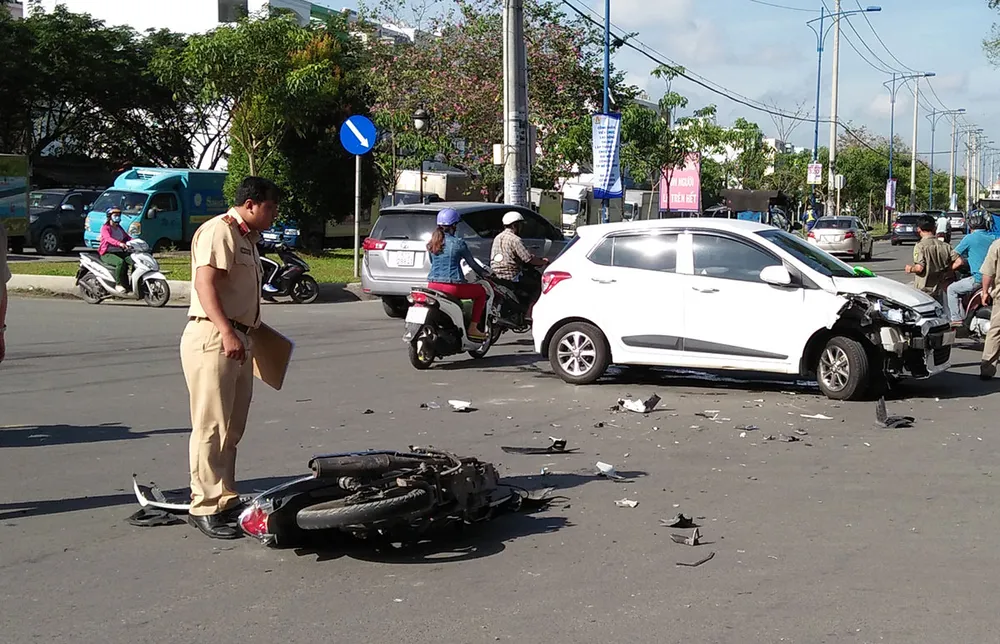 Nam thanh niên vượt đèn đỏ và tông thẳng xe máy vào ô tô ngay giao lộ trong sáng 6-1. Ảnh: H.TÂM