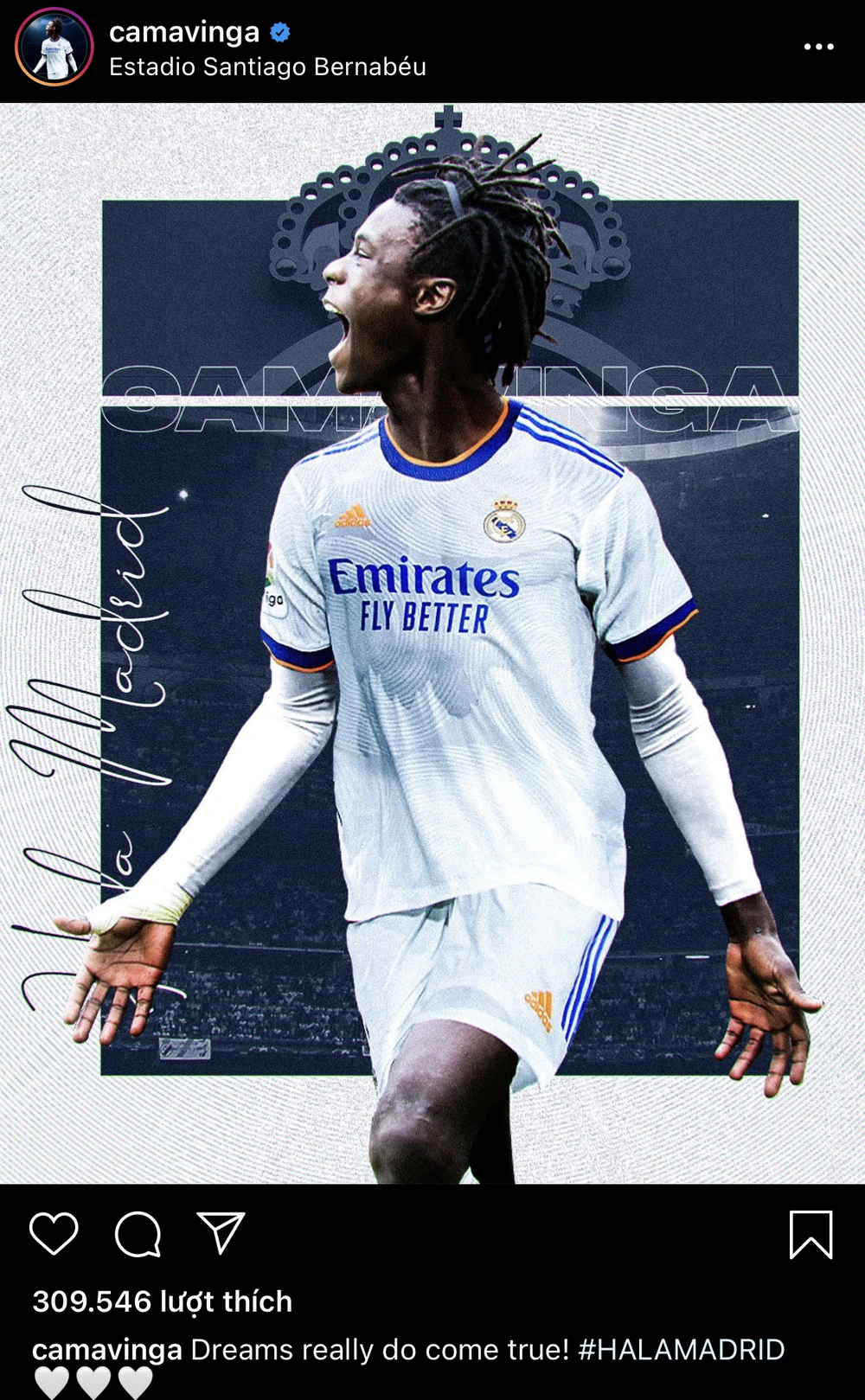 Camavinga phấn khích khi thi đấu cho Real Madrid, anh đăng trên trang Instagram của mình với nội dung: "giấc mơ đã thành hiện thực". Ảnh: Instagram/Camavinga.