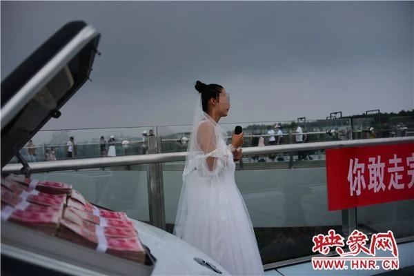 Xiao Jing đã chuẩn bị cho màn cầu hôn ấn tượng bằng cách mặc váy cưới và đứng cạnh một chiếc ô tô cùng chiếc vali đựng 10.000 nhân dân tệ (tương đương 14.500 USD) tiền mặt, tượng trưng cho của hồi môn, trên cây cầu kính nổi tiếng Fuxi Mountain Skywalk nằm ở độ cao 350 m tại TP Trịnh Châu, tỉnh Hà Nam, Trung Quốc.