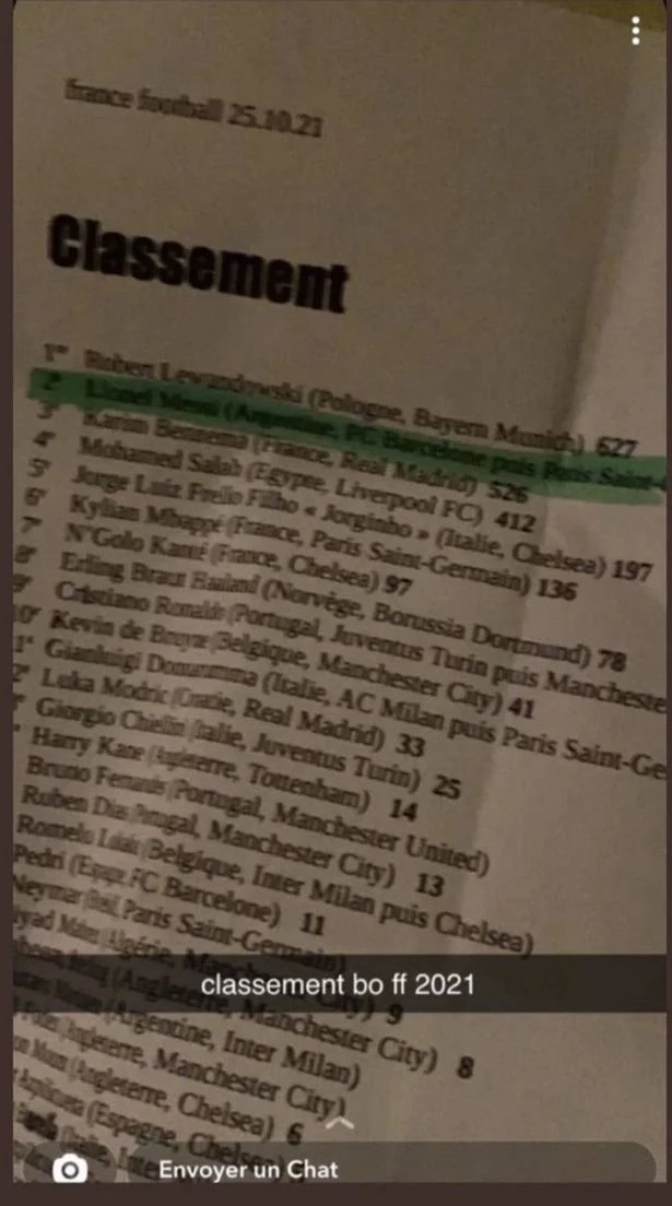 Theo đó, tiền đạo tuyển Ba Lan và Bayern Munich Robert Lewandowski đã vượt qua Lionel Messi, Karim Benzema hay Jorginho với khoảng cách điểm khá xa để giành quả bóng vàng thế giới. Rất nhiều người hâm mộ tin rằng danh sách bị rò rỉ này là giả mạo.