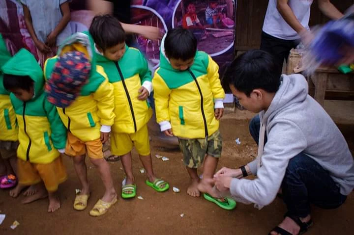 Các bạn trẻ giúp các em nhỏ đi dép mới, mặc áo ấm mới. Ảnh: Xuân Lộc