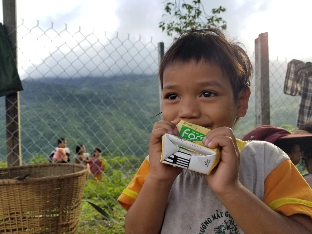 Một em nhỏ mừng quýnh khi được tặng một hộp sữa. Sữa dường như là một thứ xa xỉ đối với các em nhỏ nơi này. Ảnh: Thanh Nhật