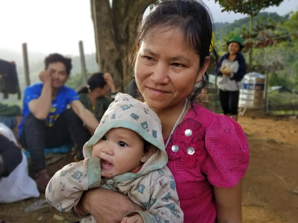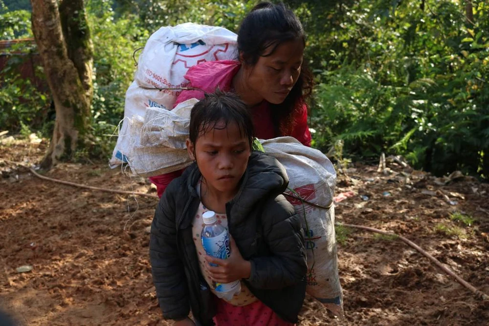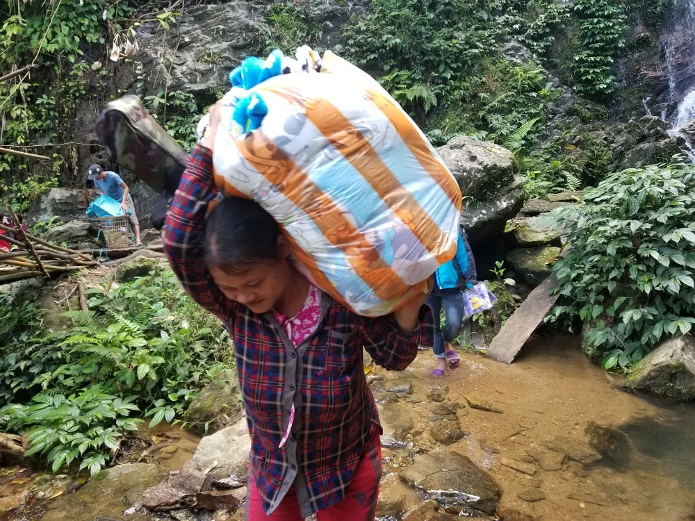 Một em nhỏ theo mẹ tham gia gùi hàng lên điểm trường. Dù đường khó đi nhưng đôi chân em vẫn thoăn thoắt, việc đi bộ dường như đã trở thành chuyện quá đỗi quen thuộc với em. Ảnh: Hạnh Trần