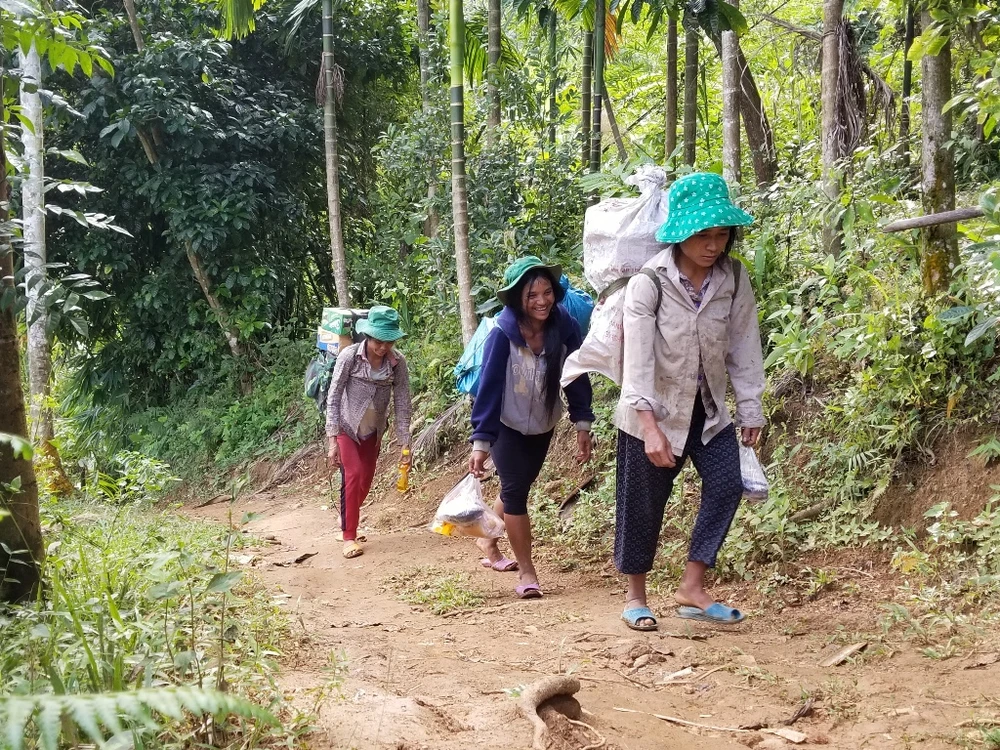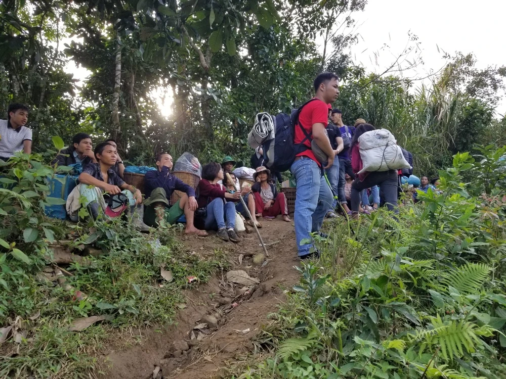 Từ trung tâm xã Trà Tập đến điểm trường Lấp Loa phải đi bộ khoảng 8 km đường núi. Vì vậy, ngay từ sớm hàng chục người dân trong làng đã có mặt để cùng các bạn trẻ "cõng" hàng lên núi. Ảnh: Thanh Nhật